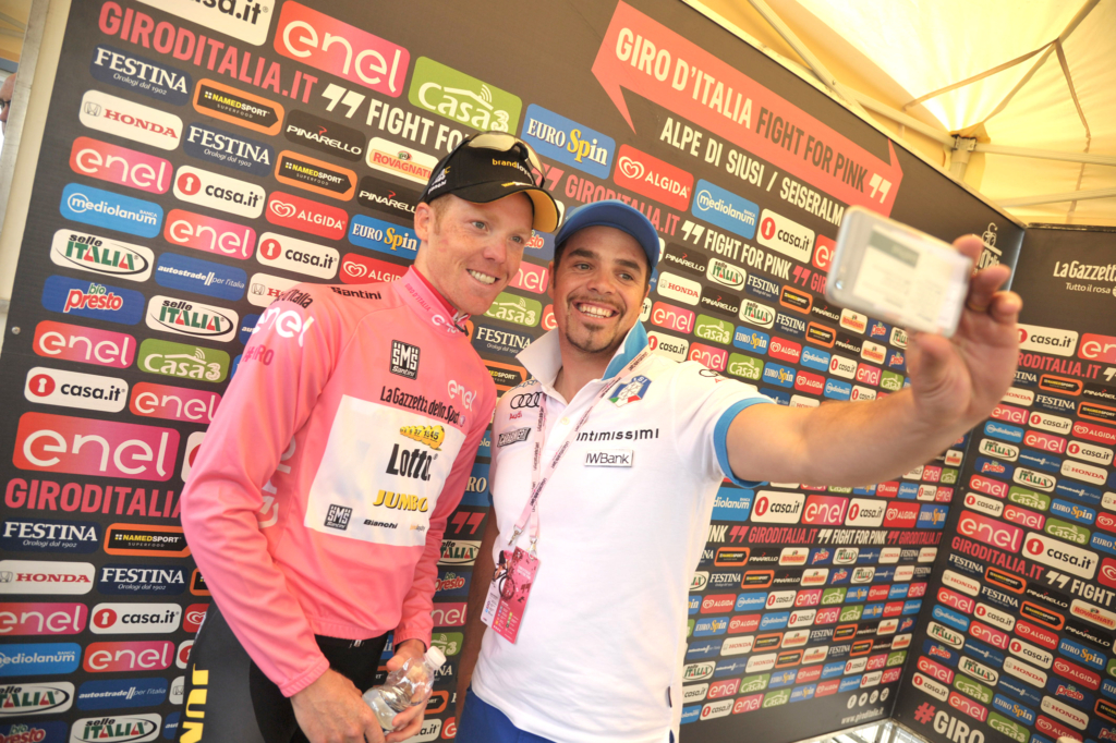 Iitalian Peter Fill (R) campion of the overall Downhill World Cup take a selfie with dutch cyclist Steven Kruijswijk (L) Lotto Jumbo team wears pink jersey with their crystal globes on the podium after winning the overall after the fifteenth stage of the Giro d'Italia 2016, long individual time trial from Castelrotto to Alpe di Susi 10,8 km, Italy, 22 May 2016 ANSA/LUCA ZENNAROCLASSIFICA GENERALE 1 - Steven Kruijswijk (Team Lotto NL - Jumbo) 2 - Esteban Chaves (Orica Greenedge) a 2'12" 3 - Vincenzo Nibali (Astana Pro Team) a 2'51" 4 - Alejandro Valverde (Movistar Team) a 3'29" 5 - Rafal Majka (Tinkoff) a 4'38" Giro d'Italia 2016 - Stage 15 - Highlights di giroditaliaLE PILLOLE STATISTICHE- Prima di Alexander Foliforov ci sono stati tre atleti russi a vincere cronometro al Giro e tutti hanno vinto anche la Classifica Generale nella loro carriera: Evgueni Berzin (3 crono, 1 Classifica Generale); Pavel Tonkov (1 crono, 1 Classifica Generale) e Denis Menchov (1 crono, 1 Classifica Generale)