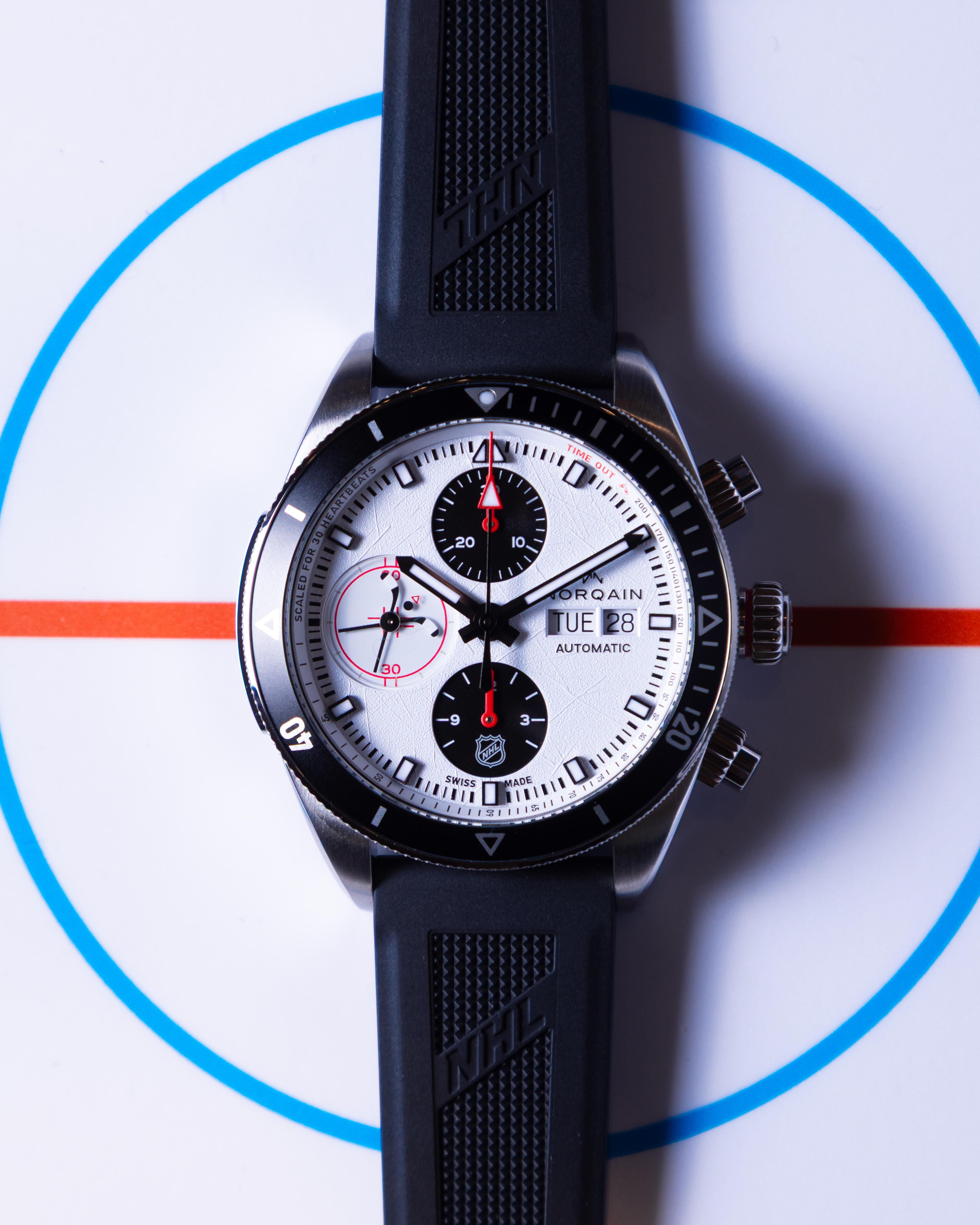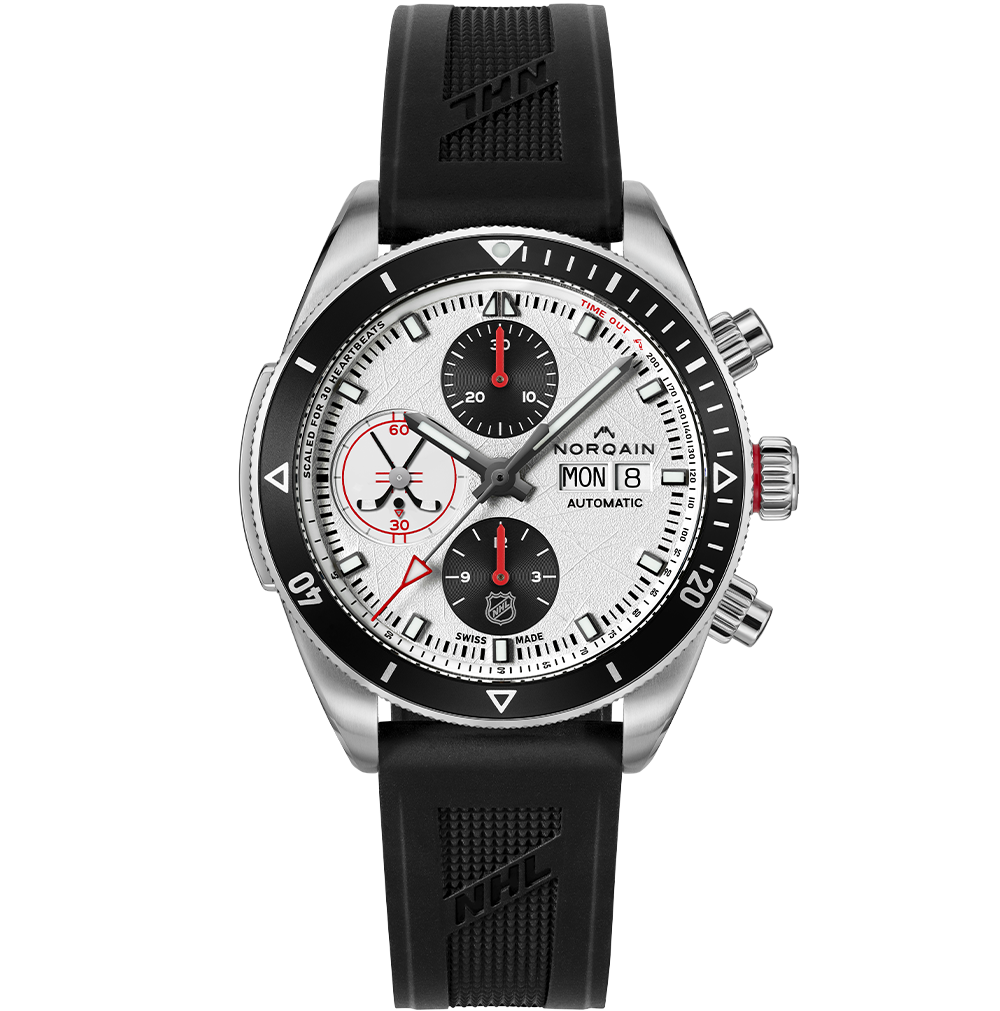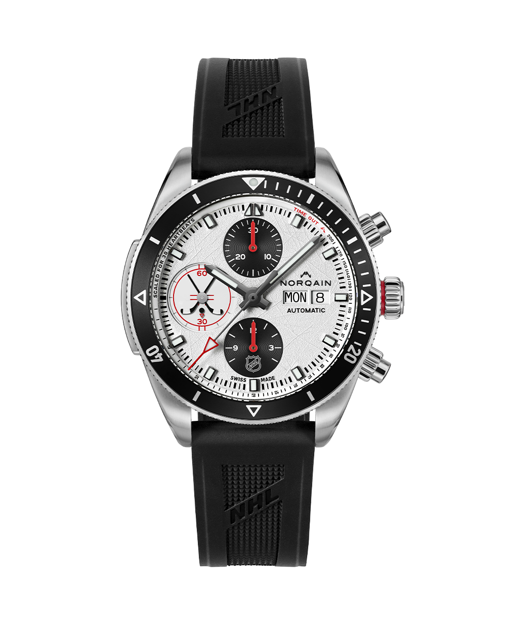 Caratterizzato da un quadrante altamente leggibile, con dettagli ispirati alle atmosfere dell’hockey su ghiaccio, presenta un cronografo di precisione, una lunetta unidirezionale e un fondello trasparente che rivela il movimento automatico di manifattura Norqain. La sua edizione limitata lo rende un pezzo esclusivo e ambito, un vero simbolo di passione e dedizione.
