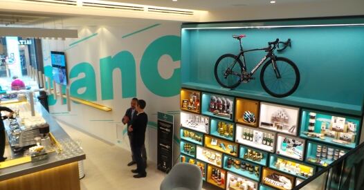 Tornando alla descrizione del "Cafè & Cycle" le biciclette Bianchi sono presenti in ogni angolo del locale, scendendo ancora di un piano, in questa alternanza di spazi e livelli creata ad hoc dagli architetti troviamo la zona officina meccanica e bike fitting...insomma il vero e proprio paradiso per i ciclisti. Tutta la gamma di biciclette Bianchi da corsa, mountain-bike, città, trekking, junior ed elettriche è disponibile presso il negozio, insieme ad una linea completa e sempre aggiornata di parti ed accessori che comprendono, tra gli altri, abbigliamento tecnico da corsa e tempo libero, caschi ed occhiali, i nuovi orologi e cronografi con movimento svizzero “Bianchi Time Pieces”, ricambi Bianchi ufficiali. Tra le biciclette esposte in vendita non manca l’innovativa Infinito CV con tecnologia Countervail® testata dalla NASA che, grazie ad uno speciale materiale in carbonio viscoelastico, elimina fino all’80% delle vibrazioni provenienti dal fondo stradale garantendo al ciclista un minor affaticamento muscolare e un maggiore controllo del mezzo. Accanto alla Infinito CV, sono presenti tutti gli altri modelli road tra cui la Oltre XR2 e XR1, Sempre Pro, Intenso e l’ampia gamma MTB tra cui spiccano i modelli in carbonio Methanol, Ethanol e Jab con ruote da 27.5” e 29”, anche nella versione full-suspension.