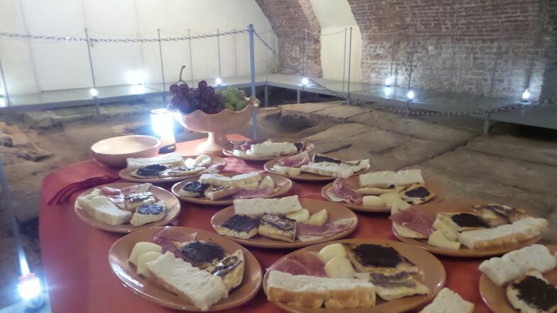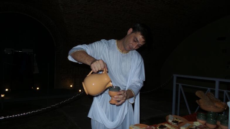Ivano, il "padrone" della taberna vi illustrerà con dovizie di particolari i cibi che vengono serviti , accompagnati da un paio di calici di Falerno, il Vinum Falernum, citato da Plinio e da altri scrittori latini.