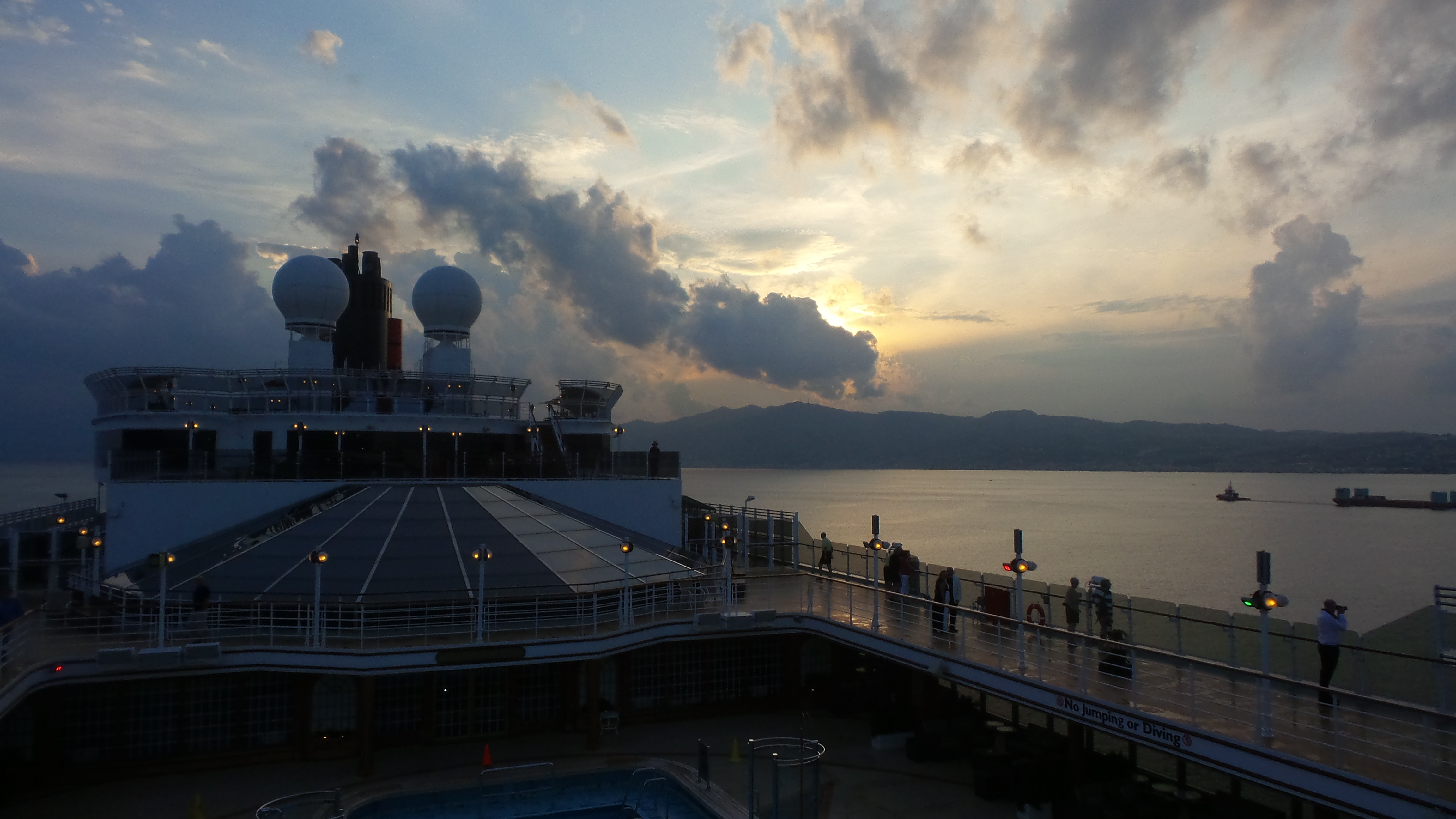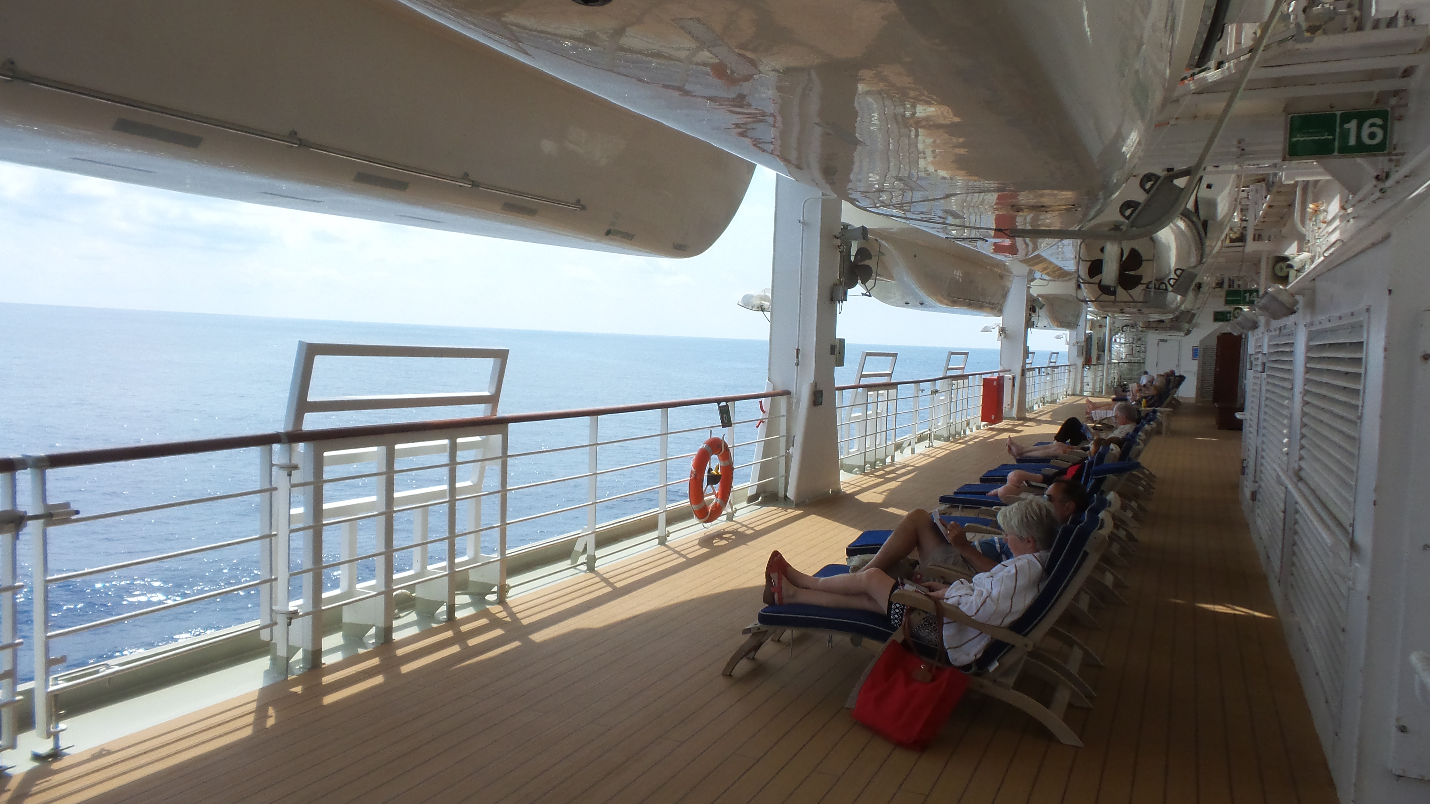 Una camminata sui ponti della nave serve assolutamente alla digestione e girovagando scopro che esiste anche un ponte passeggiata coperto al deck 3 che percorre tutto o quasi il perimetro della nave, compresa una vista impagabile a poppa, dove si può ammirare la potenza dei motori che solleva una