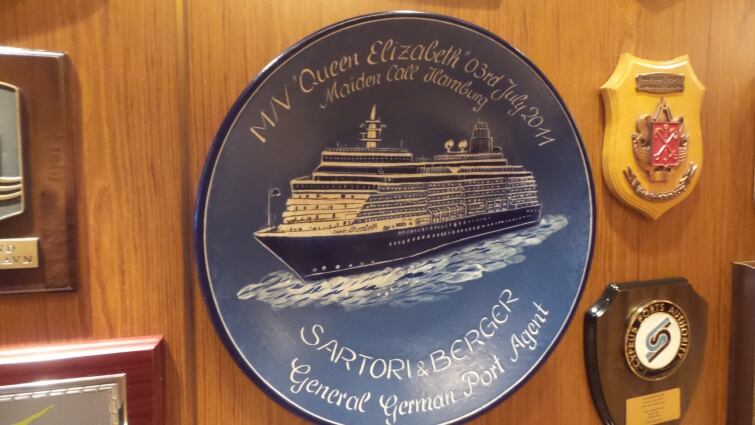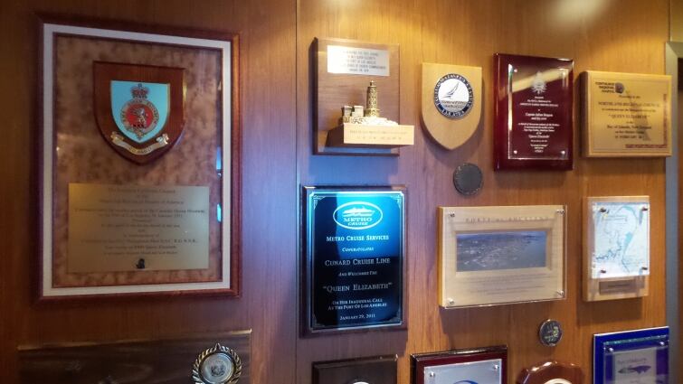 Questo bar elegantissimo si può raggiungere da due corridoi, uno a tribordo ( lato dritto della nave ) ed uno a babordo ( il lato sinistro ) entrambi fungono da galleria dove sono raccolti tutti i Crest o simili che sono stati donati alla Queen Elizabeth nei suoi viaggi intorno al Mondo.