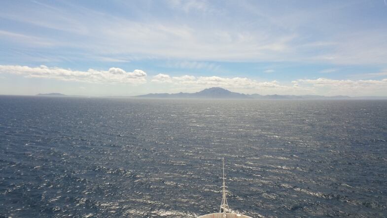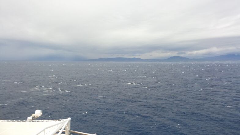 Attraversiamo lo Stretto di Gibilterra intorno alle 15.30, dopo le Colonne d’Ercole, quasi come per uno strano incantesimo, sparisce il sole, nuvoloni densi e neri si vedono all’orizzonte ed in alcuni tratti di mare si vede distintamente la pioggia che cade copiosa… sembrerebbe di entrare nell’occhio del ciclone, un po’ come descriveva Platone che posizionava Atlantide, mitica isola ricca di argento e di metalli preziosi, con il suo popolo di grandi navigatori che sprofondò in un solo giorno e una sola notte.