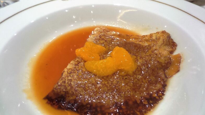 Dolce una Crepes Suzette ripena di gelato alla vaniglia e marmellata al mandarino.