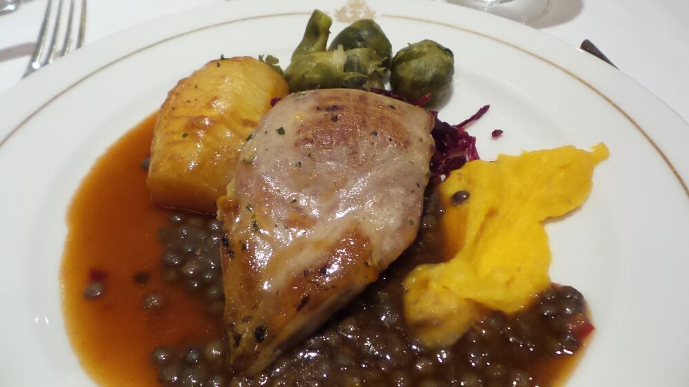 Il piatto principale è sempre pollo, questa volta servito caldo, con piselli, patate al forno, cavolini di bruxelles e purè di carote.