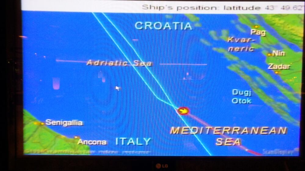 Passata la mezzanotte, intorno alla mezza, siamo di traverso ad Ancona, mancano 2278 miglia all’arrivo finale a Southampton, ne abbiamo percorsi dalle ore 17 di questo pomeriggio 138 da Venezia, ne mancano circa 130 per arrivare a Curcula che in croato si scrive Korkula.