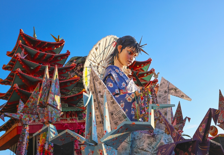 La memoria storica è al centro di “999”, opera di Carlo e Lorenzo Lombardi, padre e figlio. Ispirato alla leggenda giapponese delle mille gru di origami e alla storia di Sadako Sasaki, morta a dodici anni a causa delle radiazioni di Hiroshima, il carro si ferma simbolicamente al numero 999: un passo incompiuto che rappresenta, secondo gli autori, la pace che l’umanità non ha ancora raggiunto.